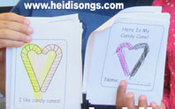 To make the candy cane, first show the children how to cut it out. Whenever I am demonstrating how to cut anything out, my students and I sing either the color word song that matches the color of the paper I am cutting, or my “Scissor” song that will be on my Classroom Management DVD. We sing a cappella, (without any CD to back us up), and very often it is the children that start the singing! I think it is a nice way to keep them focused and engaged while I am demonstrating how to do an art project and giving directions that they must follow.