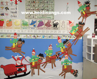 Besides being on our list of required sight words anyway, I really like using the “Here” song in December, because it is written to the tune of “Jingle Bells” and has a wonderful holiday sound to it. I also have some sets of jingle bells that I keep in my classroom, and I like to pass them out to a few kids, and let them stand up front and shake them while we sing the song. I think that last year, my class must have sung that song 50 times in December! It gets a bit tiresome, because of course EVERYONE wants to do it EVERY DAY! This year, I started throwing in a few more songs that I decided would also be good for December themes, and although they don’t have any bells in them, I think that the kids could shake bells while we sing them anyway! Luckily, except for the “Here” song, they are all on the very same CD/DVD, so that makes it easy! The new ones we have been singing are the “Help” song, because we spent a week writing about elves, and one thing that elves do is help Santa. We also included the “Make” song and the “House” song because elves make toys, and live in Santa’s house at the North Pole. And since the word “Look” comes right before the “Make” song on that same Spelling Vol. 3 Cd/DVD, we have been reviewing that one, too, because it is pretty easy to write, “Look at my elf!” or “Look at Santa!” The kids have been LOVING all of this, as long as I keep referencing elves and/or Santa. I’m willing to do it, as long as it works!