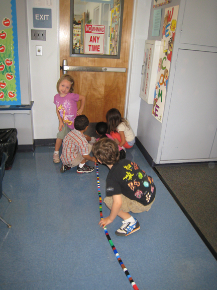 8:55-9:05 – Explain how to do the Alphabet Copy Upper Case page, and fully demonstrate the entire thing from beginning to end, verbalizing what I am doing as I go along. Example: “I am making a letter A! I start at the top and then make a diagonal line…” etc. I have found that if I only do the first few letters, many children believe that they also only need to do the first few letters! Also, if you have copied all four pages and stapled them together, then make sure they know to do ONLY the first page on top, or some will attempt to do them all. I also show them where to put it when they are done, where to put the pencil away, and how I push my chair back in. After that, is it okay that I go play with the toys in the room? NO! And believe me, I make that VERY clear. The ONLY thing that they may choose to play with when they are done with the paper is the Unifix cubes, pattern blocks, or a book. That’s it. I choose a child that I feel (or hope!) won’t cry to demonstrate this for me. I have the child make the right choice (the Unifix cubes, etc.) and I praise him for it. Then I have him make the wrong choice (dump out a box of toys) and then I put him in time out and make him sit there and watch another child play with the cubes.