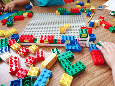When I first gave them this activity, I also put some white letter stickers on some Duplo blocks as well, and they were supposed to spell each word as well. This meant that the children had three more blocks for every word that they had to search through to find each block that they needed, for a total of about 100 blocks! I can tell you that this was FAR too overwhelming for the children, and if I had given this ANY reasonable thought at all, I would have realized that there were going to be WAY too many blocks! Below is a picture of what the activity looked like with the letter blocks included as well; I printed them on return address stickers.