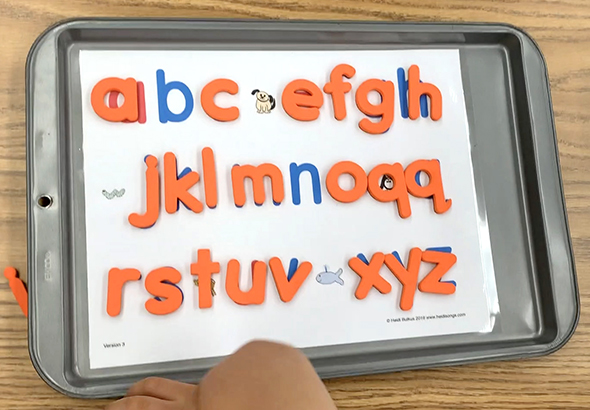 - An printable alphabet to keep letters organized. It helps to teach kids to place their letters on top of this sheet before they begin, when they are not using them. I call it an Alphabet Organizer.