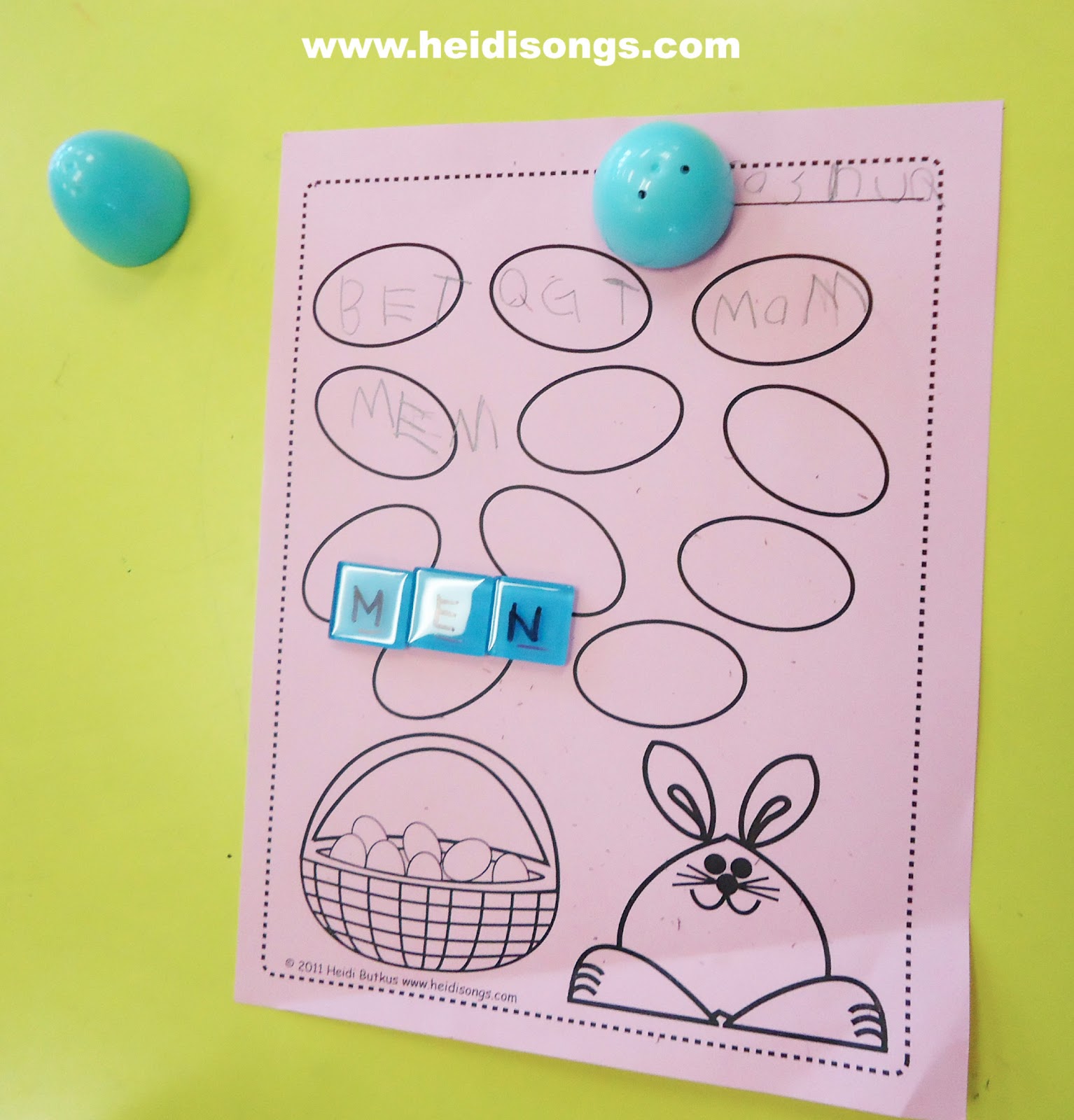 To finish prepping this activity, just write the letters that you will need for about a dozen CVC words on the tiles, and write a line on the bottom of the tile with an alternate color so that the children will know which side is up and which side is down. (We started out our activity without the lines on the bottom of the tiles, and many of the children were having quite a bit of trouble distinguishing the N’s from the Z’s and so on. So my wonderful volunteer Janice Lawson quickly fixed the situation!) Once you are done writing the letters, then put the tiles into the plastic eggs. Put the eggs into a basket or tub, and run off the recording sheet.