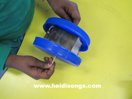 Once the painting was done, it was just a matter of finding the time to help each child put their cars together! All would have gone as planned, but then a couple of days went by without some key volunteers that I had been counting on. So we had to set the cars aside until more volunteers came. Finally, on Friday I had an extra person that could call each child back one at a time to help him or her poke a hole in the lids with a push pin, and then widen it a little bit with a ball point pen. We found out the hard way that if you widen it too much, the wheels fall right off! So if you do this project, make sure that you don’t poke a very large hole in the lids for that reason. Also, have a few extra lids on hand, just in case some of the lids fall off anyway! It is very frustrating for the kids when their wheels fall off of their cars!