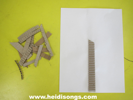 I am not sure if the author of the original post pre-cut the tree trunks and branches, but we decided that our kids would need help with this, so we decided to do that for them. We also glued down the tree trunk in the middle of the page to get them started in the right place. To prepare the cardboard, try to peel off the top layer to expose the corrugated part of it. Then cut it into strips, cutting one long strip for the trunk and some smaller strips for the branches.
