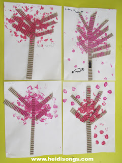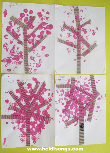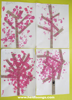 Once the children finished gluing down the branches above their tree trunks, the brought their papers over to the painting station to do the painting. I put pink paint on some paper plates, and showed the children how to dip the bottles into the paint and then use them to stamp the blossoms on to the tree!