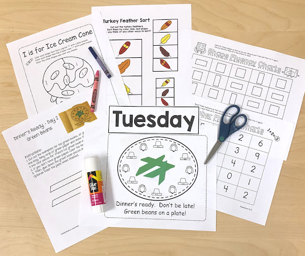 Hands on activities include making the letter I cut & glue worksheet, making the word "can" with dot paint markers, and a "Thanksgiving Dinner" themed STEM challenge, and a turkey feather sorting activity. Week 11 for Heidi is in November, and she's added some fun November themed art projects: Thanksgiving Dinner's Ready book art project. Each day students make an art page from the book, including mashed potatoes, green beans, turkey, and pumpkin pie. Directions for how to make this book art project are included, along with photos of each completed project. Please note that this packet is appropriate for either TK or Kindergarten, but can be used in Kindergarten depending on your class needs.