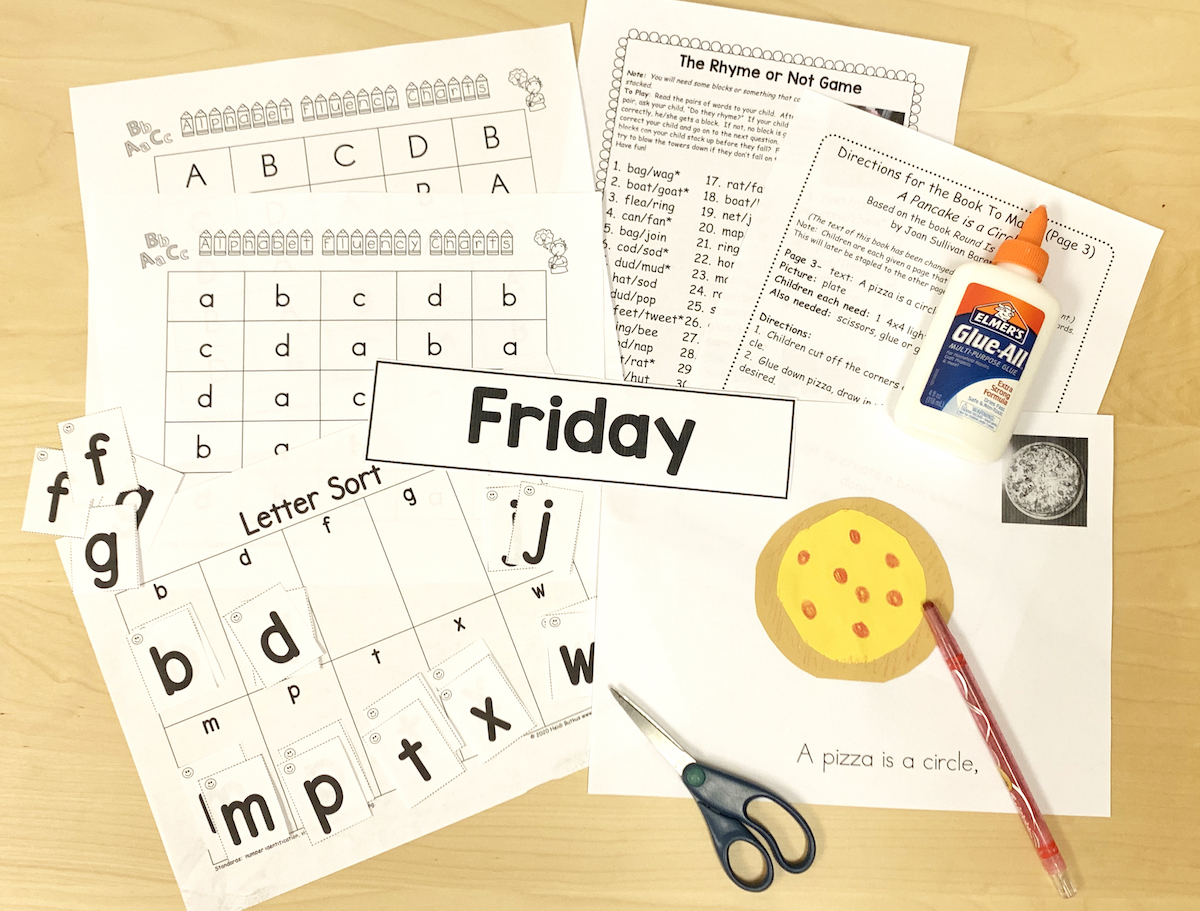 There are two worksheets to help with practice to write the letters A, B, C, & D, along with an art project for the Letter A. We have also included practice with sorting, letter recognition, counting, patterning, and scissor practice. This week we're also starting the "A Pancake is a Circle" book craft for parents (or the teacher) to print out and do. Directions for how to make this craft is included.