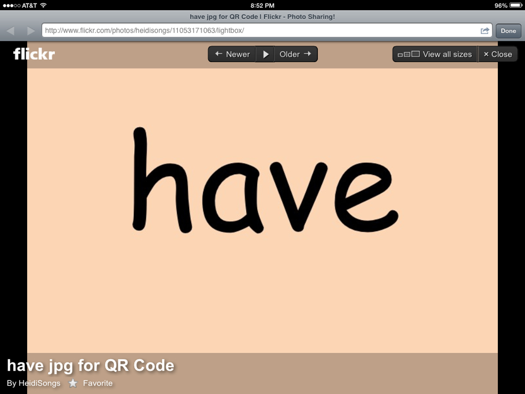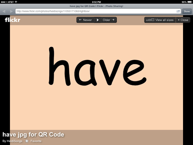 This is a scanned QR code that pulled up a jpg image posted to flickr.com. This is the entire screen of my iPad! Notice how large it is. This is much easier on little eyes, and therefore much more developmentally appropriate.