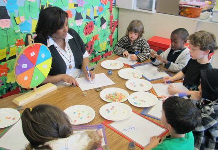 When we begin, one group goes to my language arts table, one goes to math, one goes to the art table, and one is for either an independent activity with a manipulative or some type of reading or math game or activity with a volunteer. If the volunteer doesn’t come unexpectedly, then I give the children a manipulative to play with, such as pattern blocks, Unifix cubes, or puzzles.