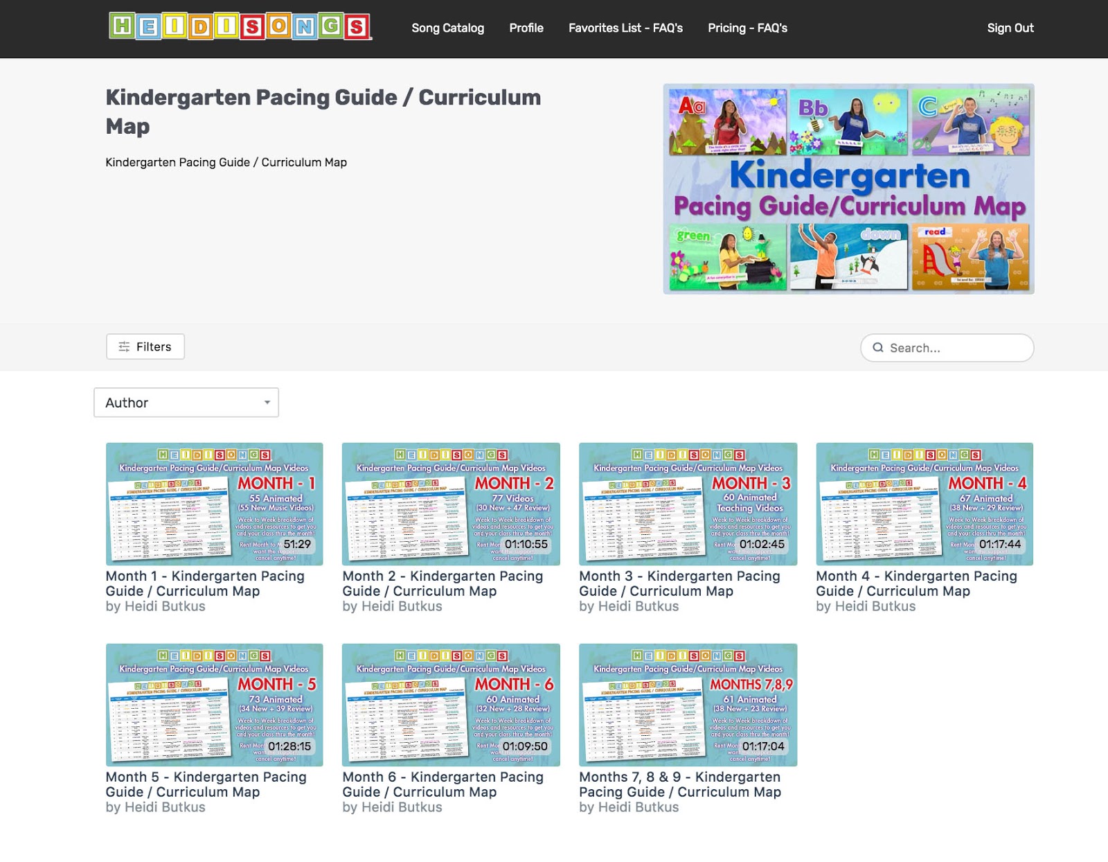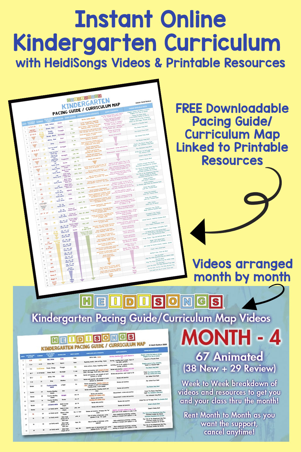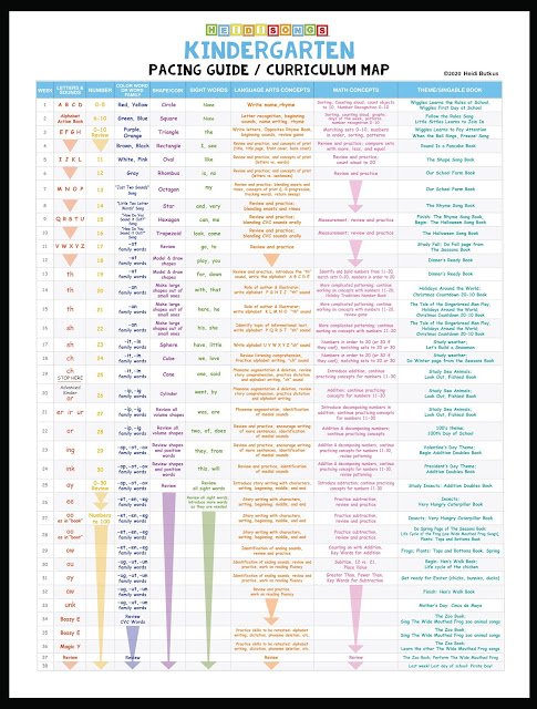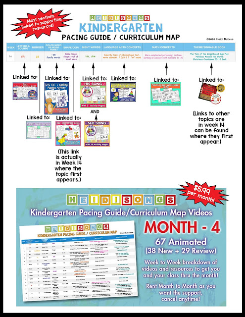 Hello everyone! Today, I am going to tell you about our Instant Online Curriculum for Kindergarten, which includes a FREE Pacing Guide/Curriculum Map with links to printable resources, and corresponds to a collection of internet videos that we are streaming on Uscreen! This video collection has ALL of the HeidiSongs videos that you should need for each of the 38 weeks of the school year, all compiled by MONTH.