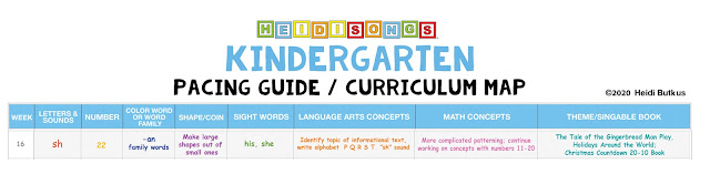 For example, let's take a look at what the Kindergarten Pacing Guide/Curriculum Map looks like for one specific week- Week 16. That's about the "kindergarten week" that my Transitional Kindergarten (TK) class is on, approximately.