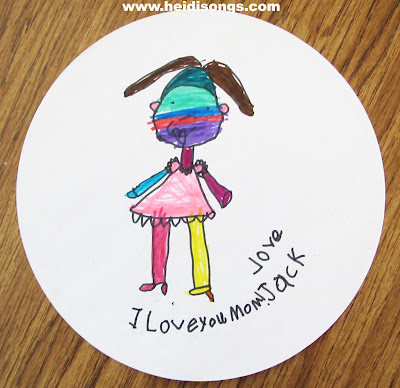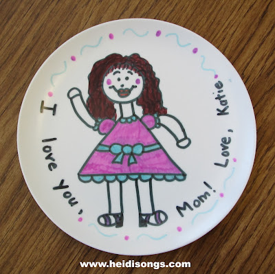 To do this project, all you need to do is download the free guided drawing directions to teach your kids how to draw their mothers by visiting my previous blog post here. Then you will need to order a Make-a-Plate Classroom Group Kit for $5.99. I picked up my kit at the CKA’s PK1 Conference! After it comes in the mail, then you will need some water soluble markers. We used some medium tipped black markers for the outlines, and then used Crayola Washable Markers for coloring it in. Anything will work, as long as it is not a permanent marker, so don’t use a Sharpie!