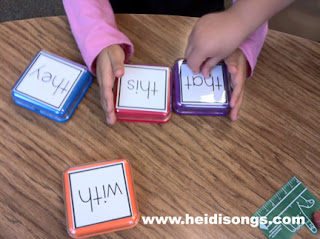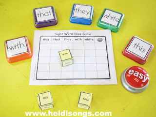 I also created a Sight Word Dice game, and had them roll a sight word, push the button, and color in a box for each time they rolled the word! They had a good time with it, but on that particular day, my class was very rowdy and would not cooperate with playing the game nicely and sharing the blocks, so they unfortunately had to be taken away from some groups.