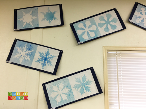 Now comes the only time consuming part: someone needs to tape down the snowflake stencils in advance. I had volunteers help me with that part, but if you don’t have any volunteers, I bet that some fifth graders would be happy to help. The fifth grade teacher at my school is always happy to give her faster workers projects like this, as long as I give her plenty of time to get it done! Now, one problem is that I had ten stencils to work with and 19 kids, so I had to do half of the class one week and half of the class the next week. Of course, some of the kids were a little confused about this even after I explained it, but they understood why they had to wait in the end!