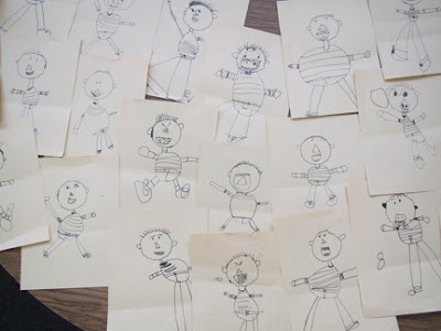 Last time, I did it in small groups, but this time I did it as a whole group. It was our first guided drawing project of the year, and I am always a bit nervous about how it is going to go, because the tendency is for kids to grab that paper and pen and immediately start drawing without waiting for directions. (I try to show them what we are going to do, and then REMOVE THE PICTURE and tell them we will do it just one step at a time, and they can only do what I do, and NOT draw ahead of me!) I prepped them as much as I could for it, but two of them went right off and started trying to draw David without waiting for me, of COURSE. But at least it was only two of the 23 children. Once I stopped them before they got too far and then got the whole group going on a step by step basis, it went just great! We did the drawing on the first day, and the coloring on the second day. And I did do the coloring as guided coloring, and told them that since we were going to make it into a book, they would need to color it exactly as I said, and could only use the colors that I told them to use.