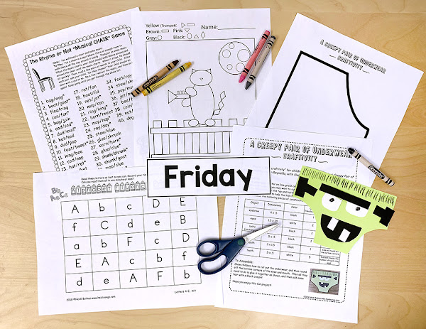 Hands on activities for Week 8 include making the letter F out of play dough, making the word "like" with dot paint markers, and using pattern blocks to make the word "like". Week 8 for me is the first week of October, so I added some fun October themed art projects including a pumpkin, black cat, and "creepy pair of underwear". Check out my Creepy Pair of Underwear blog post for more info on this art project! Directions for how to make these crafts are included, along with photos of each completed project.