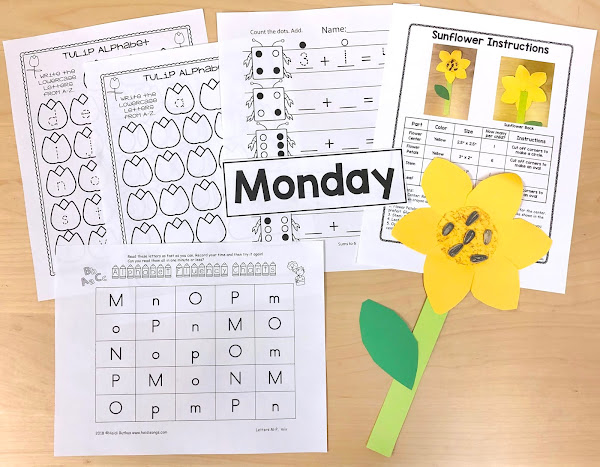 Hands on activities include: Sunflower craft, Play Dough number worksheet & activity*, Flower and Bee, and "I Love You" Optical Illusion Spinners craft, Flower Sorting* cut & glue, Mother's Day Card - Guided Drawing, Flower Petal Addition craft with dice, Flower Patterns* - cut & glue