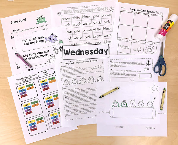 Hands on activities include: Frog craft, Tadpole craft, Frog Life Cycle sequencing cut & glue, Five Frogs on a Log guided drawing, Frog Patterns cut & glue, Poison Dart Frogs coloring page, Frog Sizes sorting page, Frog Sock Puppet & "Fishing" for sight words activity