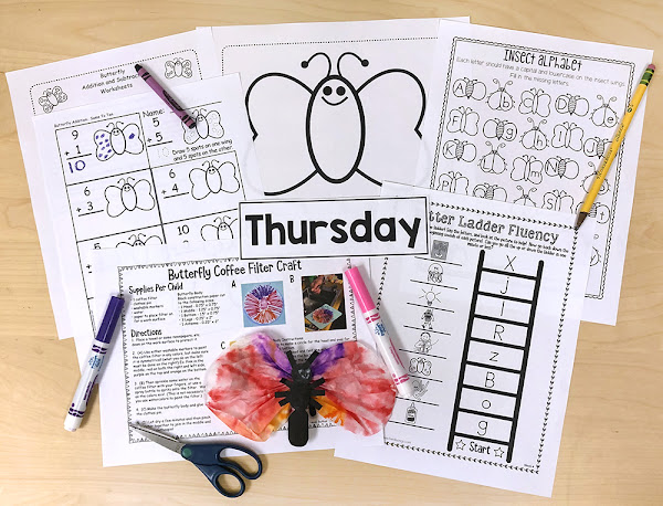 Hands on activities include: Ladybug craft, Bee craft, Caterpillar craft, Butterfly Coffee Filter craft, Guided Drawing Insects: butterfly, bee, ladybug, caterpillar, Rhyming Bugs cut & glue*, Write the Room Insects activity*, Is It an Insect? Sorting*