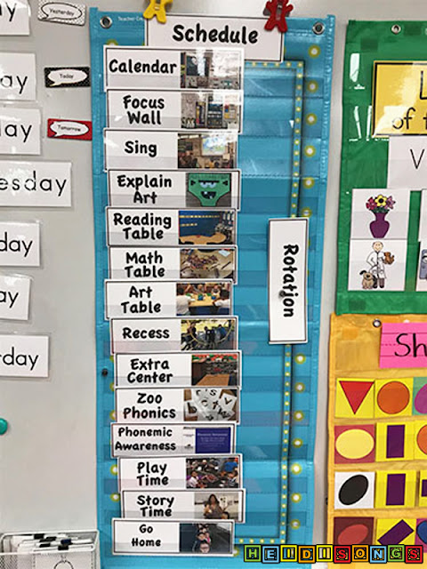 I tell the children to look at the schedule. I tell them what we are going to do that day as I go down the schedule and talk them through it. Usually, the days are the same, unless there is an assembly or “specials,” such as library or computer lab on Tuesdays. This is the first year I have had a visual schedule, and I must say I really like it! I developed it to help a couple of children who really needed it this year, but I think it is actually helping my entire class. I’m getting many fewer questions about when it will be playtime, when we will be going home, etc.