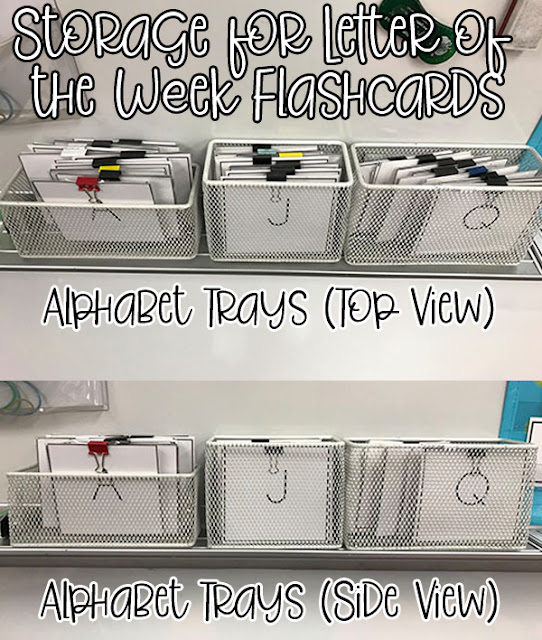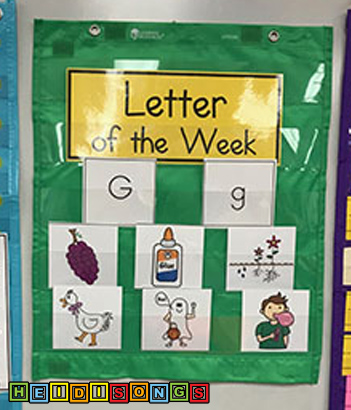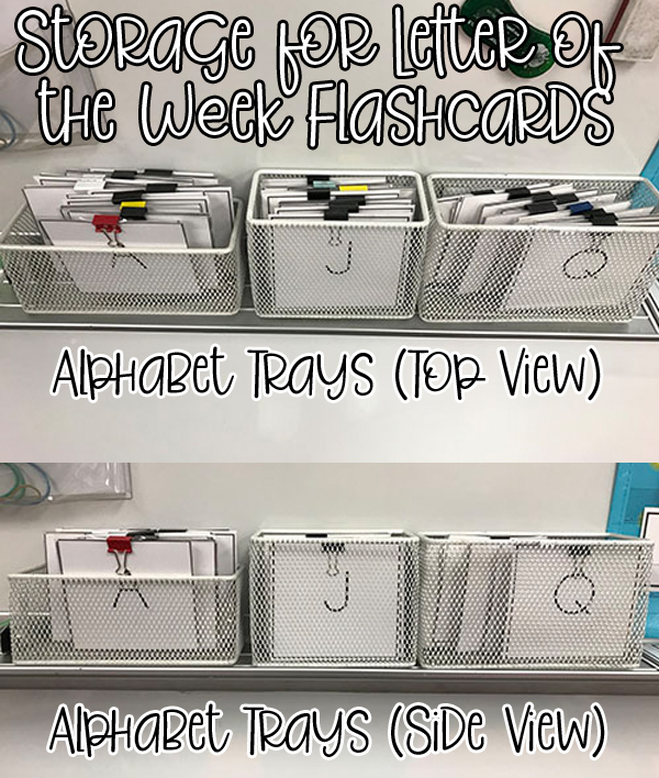 For our letter of the week, this is what I do, assuming I’m using the example of the chart for the letter G, pictured above. “What’s that letter? (G.) “Give me the G sound.” (/g/) “Okay, let’s read our G chart!” Then, everyone together says, “G like grapes, G like glue. G like grow, G like goose. G like ghost, G like gum!” The pictures on the letter of the week charts came from our Letter of the Week Flashcard Set, and they match up exactly with our Alphabet Workbook Volume 2. I store them in little magnetic baskets that sit on the whiteboard tray. See picture below!
