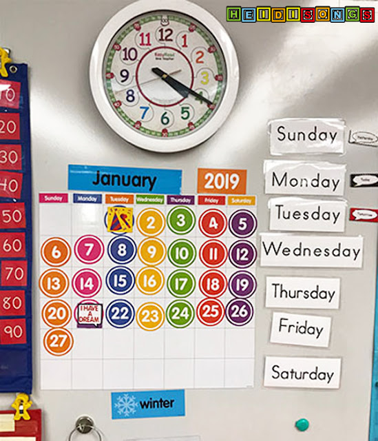 I point to yesterday’s date and ask them to tell me the number, and then try to tell me the number that comes next. Then I go straight “up the elevator” to find the day of the week. Since my magnetic calendar is pretty small, the days of the week are too small for them to read. So I printed up the days of the week on cards for them to read. I point to the correct day of the week, and ask them to read it. Then we sing the Days of the Week song (available on my Classroom Management CD/DVD here) and then say the entire date together. Example: “Today is Monday, February 4, 2019.” Then I point to the season card and ask them to read it, as I emphasize the beginning sound. Example: “The season is… /w/ /w/ winter.”