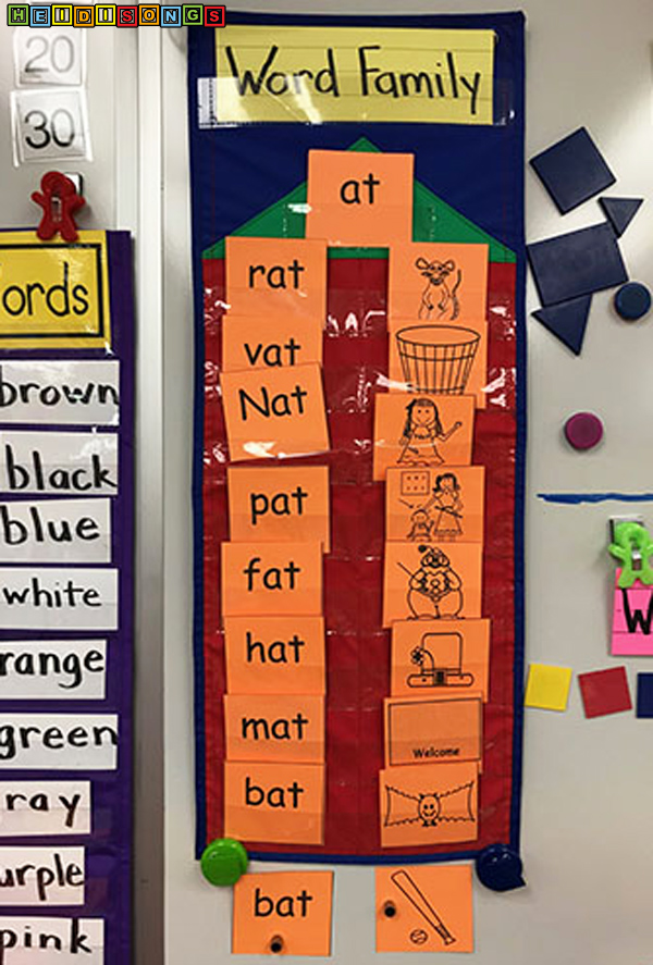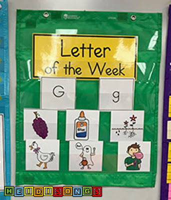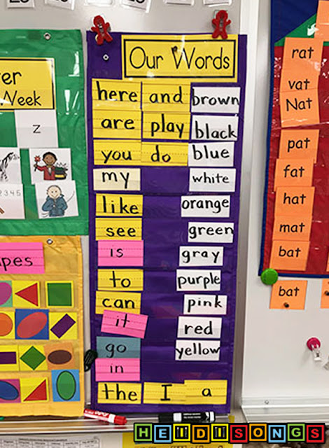 For the sight words, all I do is point to them and have the kids read them. But after we finish our Focus Wall time, we go straight into our singing time, and that’s when we sing our Sight Word Songs! See a video clip of one below. When each song is over, we spell it and read it together. That’s easy to remember because it comes up on the video that way! I teach four new words a month in TK. To make the chart, I just typed up the words “Our Words” and put it at the top, because that is what would FIT, ha ha. Then I wrote the words I needed on sentence strips. Soon, I will need to add an additional pocket chart to make room for a few more words. But if I had to teach fifty words, I would just take some of them down, and put new ones up, rotating the words up and down occasionally for review.
