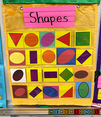 For the shapes chart, I simply point and have the children tell me the shapes. Now and then, I like to ask them to tell me what the difference is between certain shapes. For example, how do I know this one is a rectangle and not a square? How do we know that one is a triangle and not a rectangle? What’s the difference between a circle and an oval? By the way, most of the shape cards that I use came from a set that I purchased from ReallyGoodStuff.com, but it did not include the oval, so I had to make those myself, unfortunately. I used their shape chart at the link last year, but didn’t really see a lot of results from it, and it does take up a lot of space.