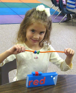 Here’s an idea I had for sight words using those pencil boxes with the slide out tray, available at Office Depot and other office supply stores. I was going to put the plastic letters for one word in the box, write the word on the top of the box, and then the kids could build the word together. Well, I decided to use Sight Word String-Ups in the boxes! If you haven’t seen Sight Word String-Ups yet, go to ReallyGoodStuff.com or Amazon.com. They are plastic letters with a hole in them for stringing words, but instead of strings, which are hard to manipulate and tangle up a lot, they use pipe cleaners. The hole in the letters is large enough for the pipe cleaners to go through. (The kit comes with 4 trays, word cards, and about 260 letters.) I figured that I would use those letters in my pencil boxes, and put a pipe cleaner in there with them.